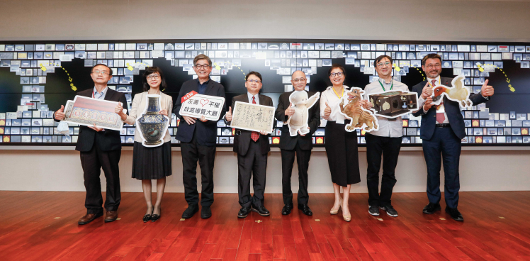 申博太陽城攜手創(chuàng)利空間為故宮建置的智慧文物互動導(dǎo)覽墻及輪播墻,今日正式啟用。(左四:申博太陽城新事業(yè)暨投資管理總部副總經(jīng)理楊本豫、右四:故宮博物院院長吳密察、右三:太極影音董事長黃寶云)