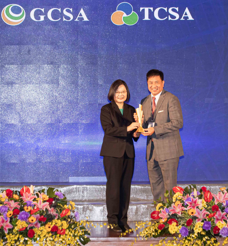 友達(dá)勇奪臺(tái)灣永續(xù)企業(yè)獎(jiǎng) 13 項(xiàng)大獎(jiǎng) ,由總統(tǒng)蔡英文頒獎(jiǎng) (左),友達(dá)董事長(zhǎng)彭雙浪 (右) 代表領(lǐng)獎(jiǎng)