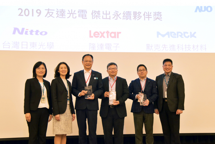 友達(dá)肯定供應(yīng)商永續(xù)經(jīng)營(yíng)的優(yōu)異表現(xiàn),頒發(fā)傑出永續(xù)夥伴獎(jiǎng) (圖左到右:友達(dá)光電永續(xù)長(zhǎng)古秀華、友達(dá)光電供應(yīng)鏈總部資深協(xié)理吳宜芳 、默克先進(jìn)董事長(zhǎng)謝志宏、隆達(dá)電子財(cái)務(wù)副總張博儀 、臺(tái)灣日東光學(xué)董事長(zhǎng)塩見太、友達(dá)光電董事長(zhǎng)暨執(zhí)行長(zhǎng)彭雙浪)