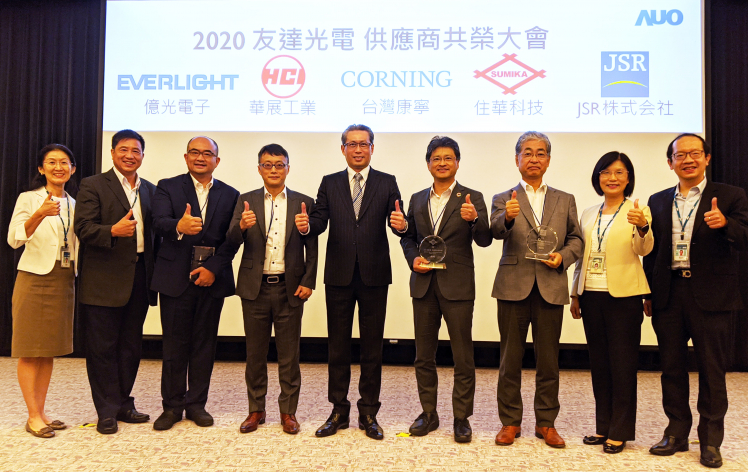 達(dá)肯定供應(yīng)商永續(xù)經(jīng)營的優(yōu)異表現(xiàn) ,頒發(fā)永續(xù)夥伴、環(huán)境友善及社會共融等獎項(xiàng) 。(左三:億光副總經(jīng)理李家豪 、左四 :華展執(zhí)行副總黃啟業(yè)、中 :臺灣康寧總經(jīng)理曾崇凱、右四 :住華總經(jīng)理暨營運(yùn)長枝松邦茂 、右三 :JSR 董事長根本宏明) |