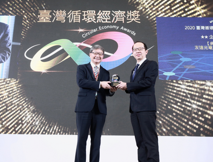 友達(dá)榮獲「2020 臺灣循環(huán)經(jīng)濟(jì)獎 - 典範(fàn)獎」,由環(huán)保署副署長沈志修 (左) 頒獎 ,友達(dá)技術(shù)長廖唯倫 (右) 代表受獎。